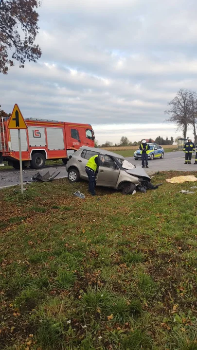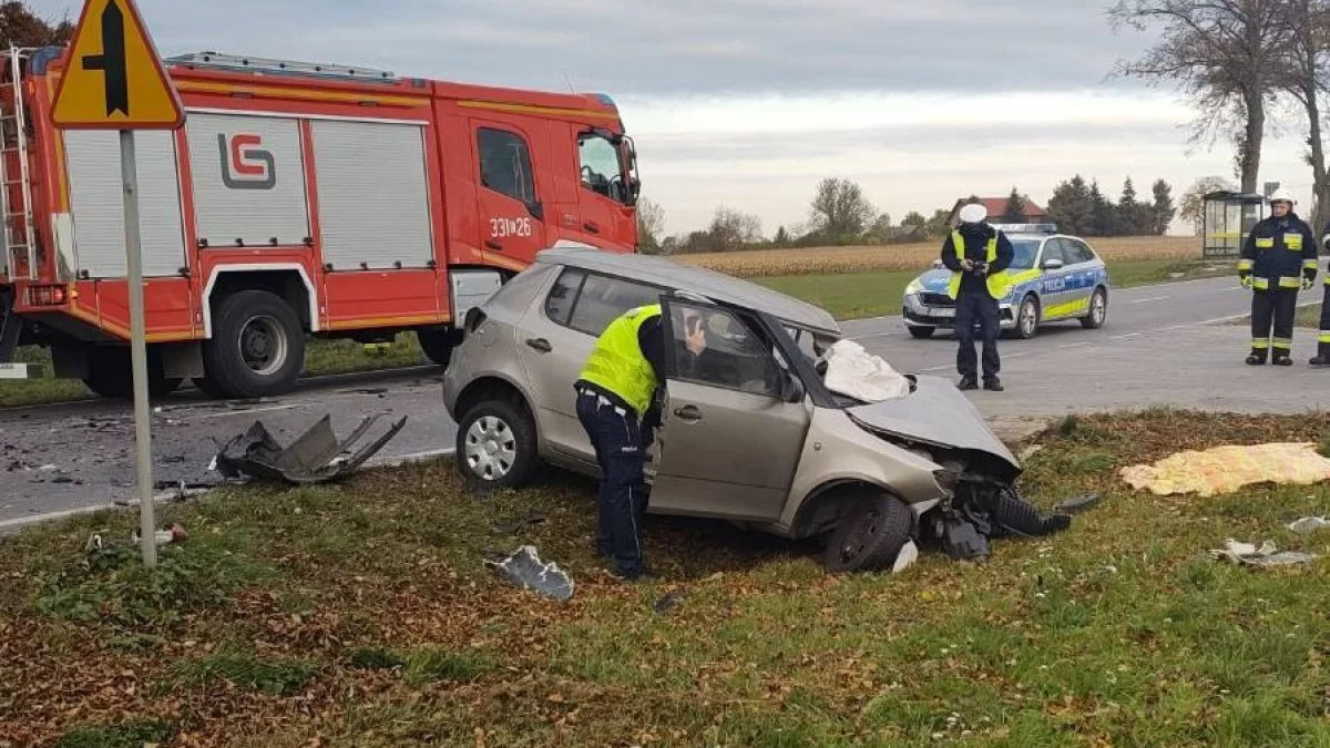 Kobieta kierująca osobówką z bardzo poważnym urazem nogi została przetransportowana do szpitala. Na miejscu interweniowały służby ratunkowe, w tym śmigłowiec Lotniczego Pogotowia Ratunkowego.