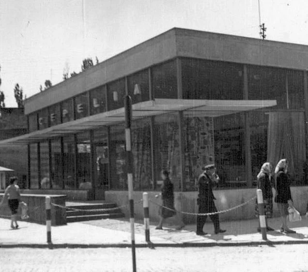 Wygląd dawnego sklepu "Cepelia" zachował się tylko na starych fotografiach z lat 60. Przeszklony pawilon w stylu modernistycznym został wybudowany w latach 1962-1963. Prosta bryła z ogromnymi szybami wystawowymi to jeden z przykładów budownictwa tego okresu. W posobnym stylu utrzymany jest między innymi Dom Nauczyciela wzniesiony w pobliżu w podobnym okresie.