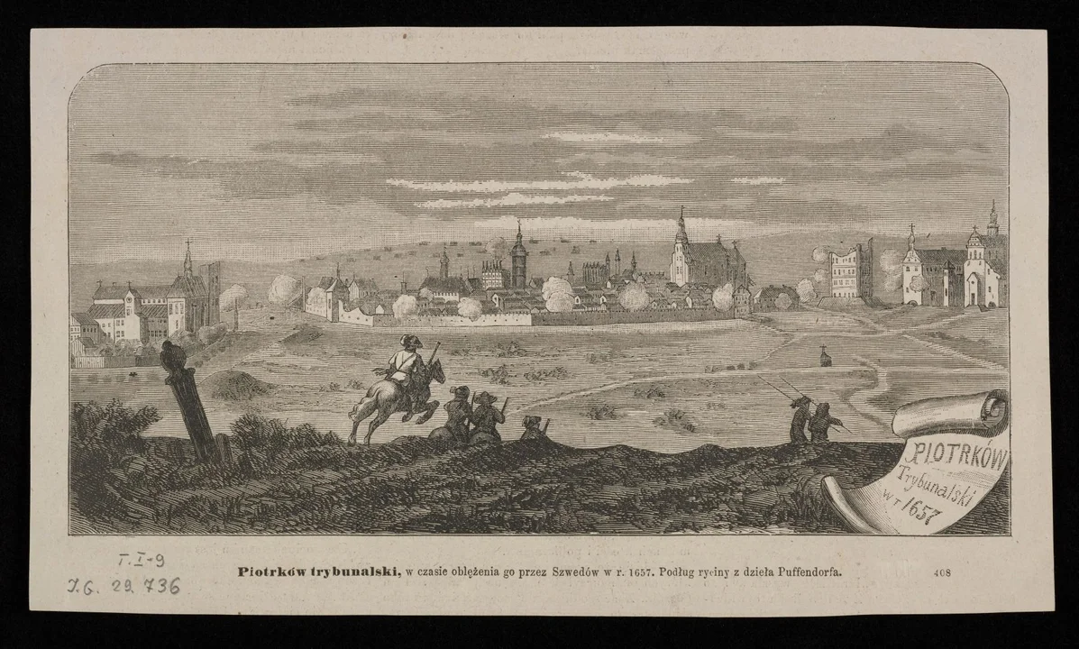 Innym dokumentem jest miedzioryt wg rys. Eryka Dahlberga z 1657 roku zawarty w dziele Samuela Pufendorfa "De rebus Carolo Gustavo Suecie Regis gestis..." z 1696 r.. Widok pokazuje miasto od strony południowej. Widoczny na sztychu mur obronny ma blankowy krenelaż, poniżej którego umieszczone są liczne strzelnice dla broni palnej. W południowej części zachodniego boku miasta występuje jedyna baszta w tej części fortyfikacji. Jest to czworokątna budowla przykryta czterospadowym dachem namiotowym, występująca obustronnie przed lico muru.