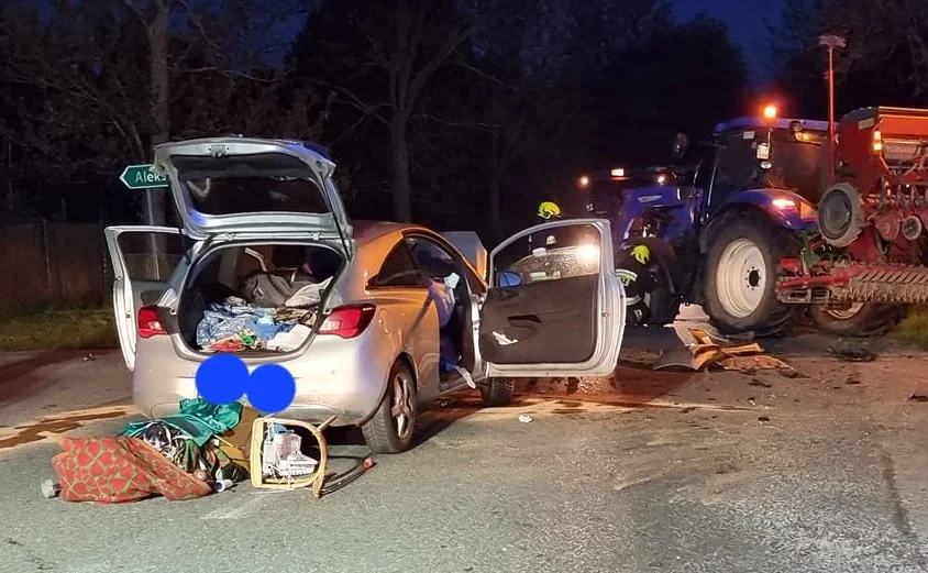Do groźnej kolizji doszło we wtorek (9 maja) w miejscowości Kawęczyn (gmina Aleksandrów). Około godziny 20:30 samochód osobowy marki Opel Corsa na wysokości skrzyżowana zderzył się z ciągnikiem rolniczym. Siła uderzenia była na tyle duża, że przód Opla został całkowicie zniszczony.