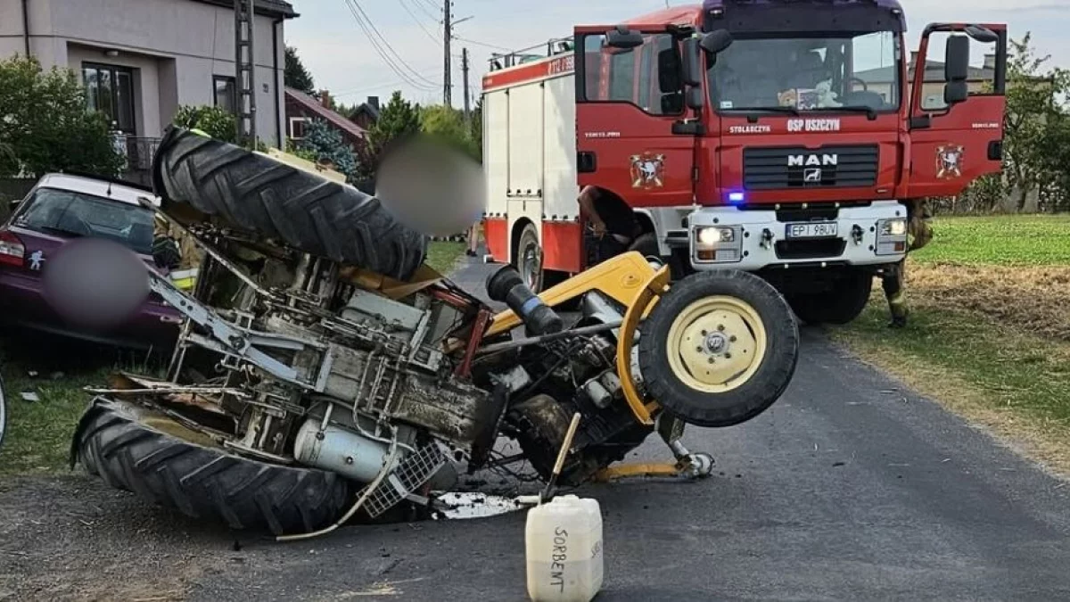 W czwartek, 21 sierpnia w Uszczynie, w gminie Sulejów doszło do zderzenia ciągnika i osobówki. Wszystko działo się około godziny 18:00 na ul. Rolniczej. Kiedy służby dotarły na miejsce, zastały przewrócony na bok pojazd rolniczy i samochód osobowy, który wjechał w pobliskie ogrodzenie. O działaniach mówią druhowie z Ochotniczej Straży Pożarnej w Uszczynie.