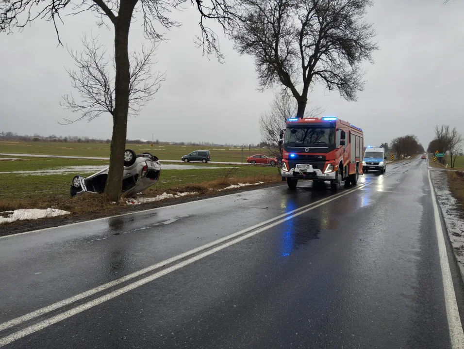 Samochód osobowy dachował. Jego pasażerka została przewieziona przez zespół ratownictwa medycznego do szpitala.