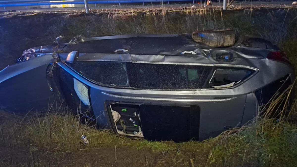 Niestety, siła uderzenia okazała się na tyle duża, że skoda wypadła z jezdni i dachowała na poboczu.