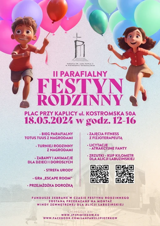 Przed nami II Parafialny Festyn Rodzinny upamiętniający rocznicę urodzin św. Jana Pawła II, który organizowany jest przez Parafię Rzymskokatolicką św. Jana Pawła II w Piotrkowie Trybunalskim. Wydarzenie odbędzie się 18 maja w godz. od 12:00 do 16:00 na placu przy Kaplicy na ul. Kostromskiej 50A.